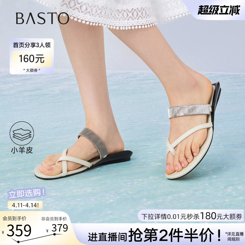 百思图2026夏季商场新款羊皮人字拖休闲外穿女平底拖鞋E6771BT6