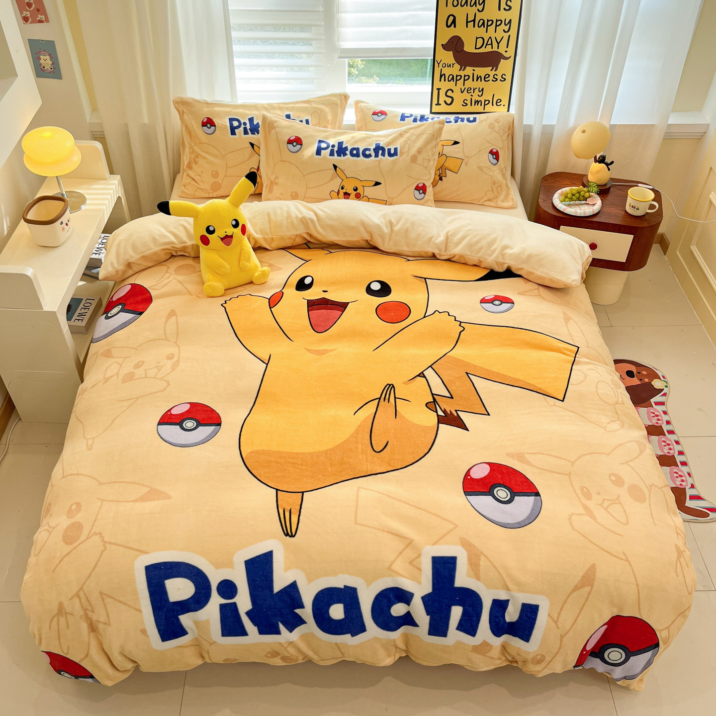皮卡丘加厚牛奶绒被套单件冬季加绒儿童被罩卡通珊瑚绒床上四件套