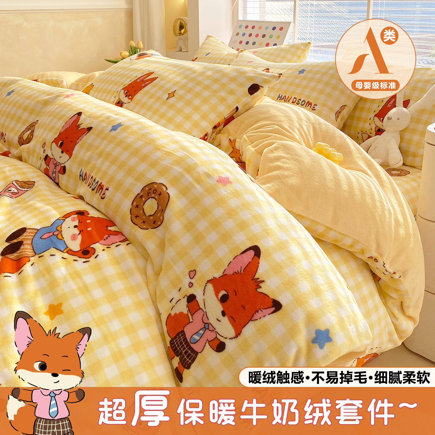 卡通牛奶绒四件套加厚珊瑚绒法兰绒毛被套床单冬季床上用品三件套