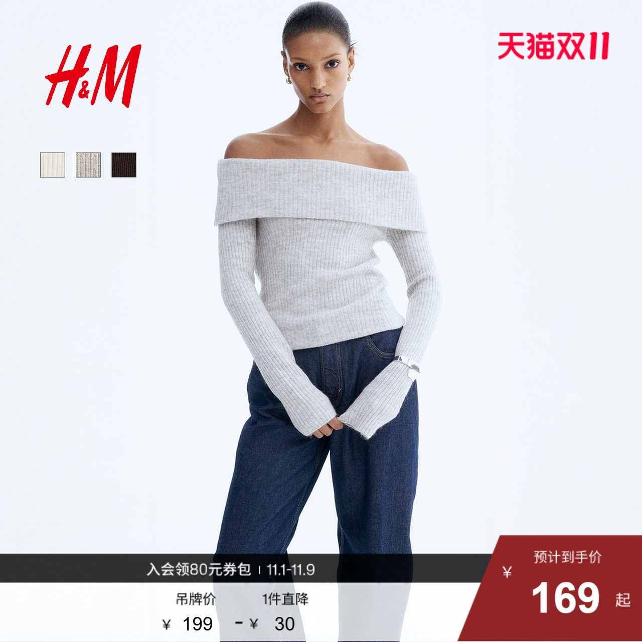 HM女装毛针织衫2025年秋季新款罗纹一字肩保暖休闲上衣1293121