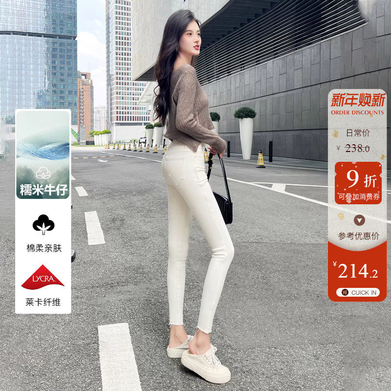 弹力巨好~两粒扣加绒小脚牛仔裤女米白色修身显瘦靴裤九分铅笔裤