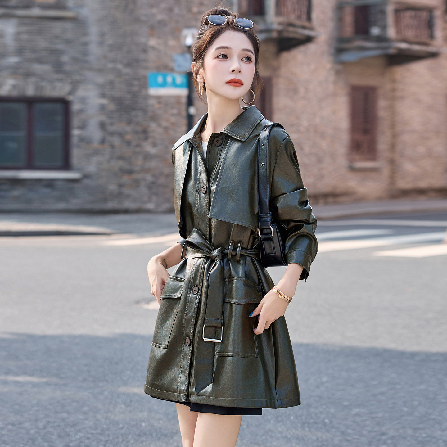 皮衣2025年新款女外套春秋宽松系带中长款机车时尚收腰复古欧货潮