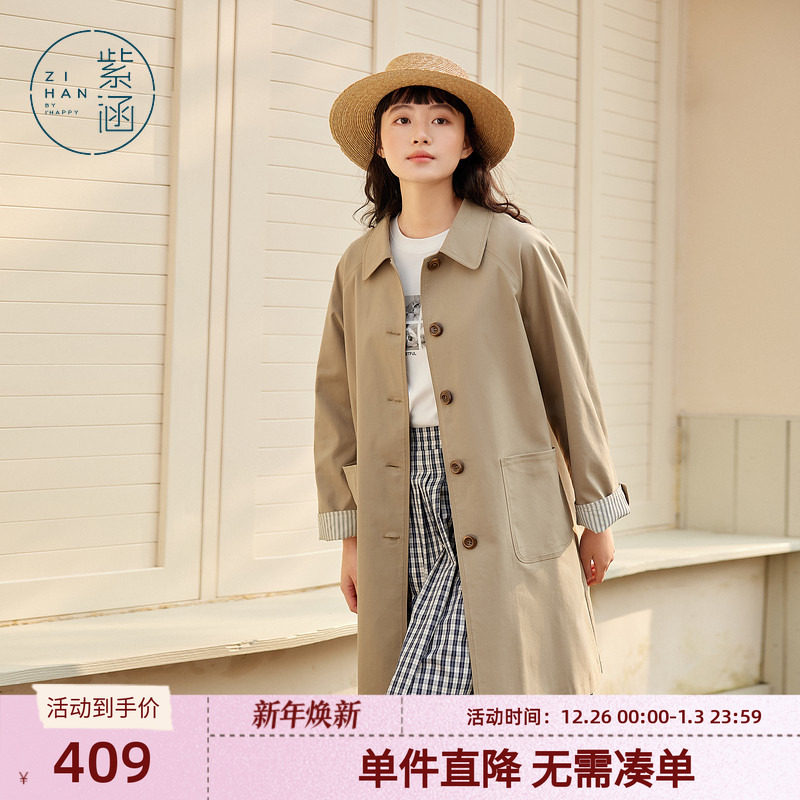 紫涵中长款翻领风衣女春秋季新款英伦风单排扣宽松防风通勤外套潮