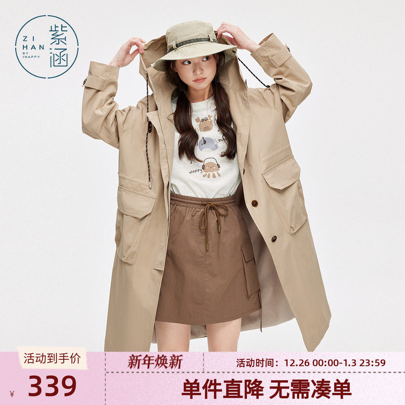 紫涵工装休闲连帽风衣女中长款春秋季新款撞色纽扣简约通勤外套潮