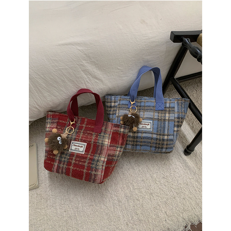 网红ins复古格纹毛呢托特包女大容量通勤手提包大学生单肩手拎包