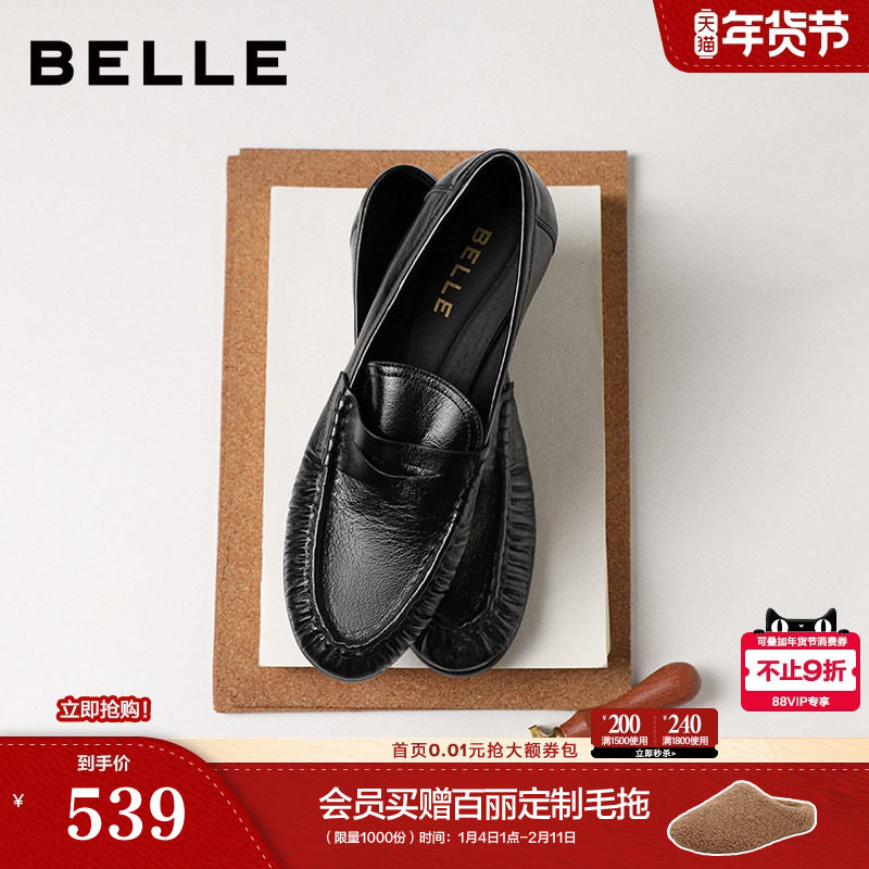 百丽褶皱乐福鞋女26春季新款真皮黑色小皮鞋豆豆单鞋子F3S1DAA6预