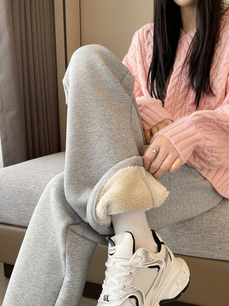 加绒运动裤女秋冬羊羔绒裤子女款冬季加厚冬天棉裤直筒灰色卫裤冬