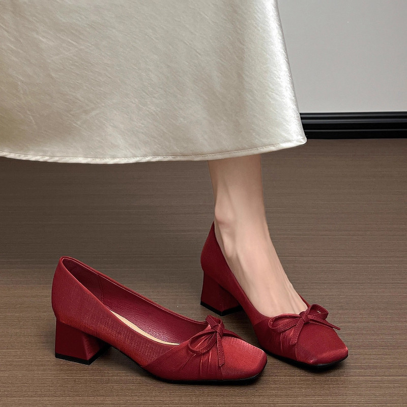 羊皮版~ 红色伴娘婚鞋喜婆婆婚宴单鞋配旗袍气质方头高跟鞋女粗跟