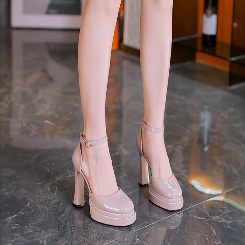11cm一字扣带超高跟鞋女春夏新款粗跟防水台漆皮中空气质百搭单鞋