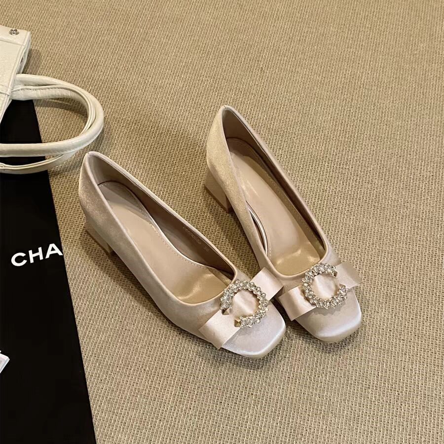 羊皮版法式温柔配裙子粗跟浅口单鞋女水钻扣蝴蝶结缎面方头高跟鞋