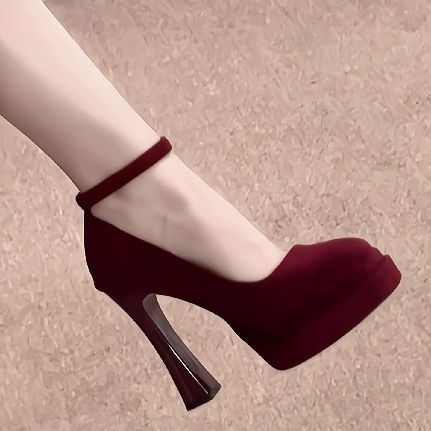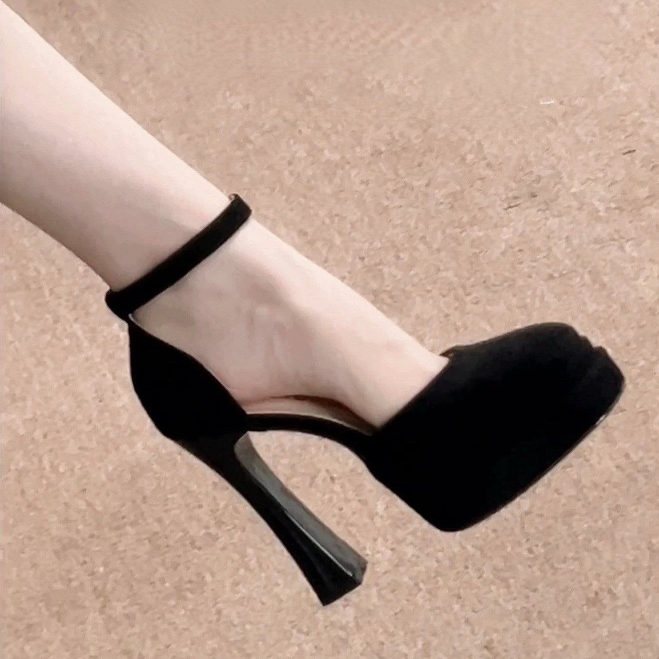 性感黑色绒面百搭一字扣带高跟鞋女粗跟双层防水台走秀10CM单鞋子