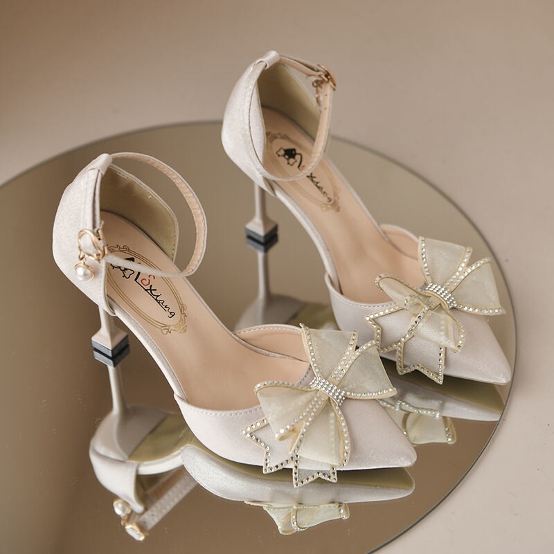 春大东高跟鞋女2023年新款尖头细跟单鞋百搭浅口水钻蝴蝶结伴娘鞋