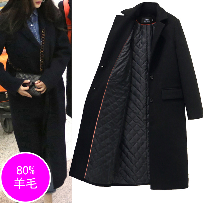 黑色毛呢外套女夹棉加厚秋冬季韩版加棉高个子加长款正肩呢子大衣