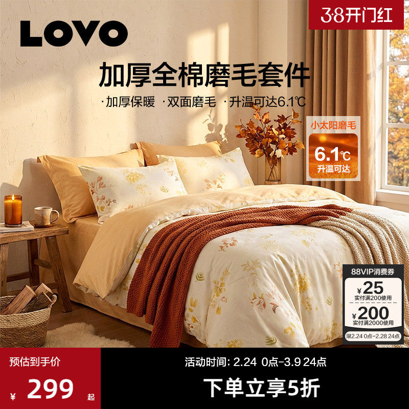 罗莱家纺LOVO磨毛加厚四件套全棉纯棉被套三件套床单秋冬季保暖