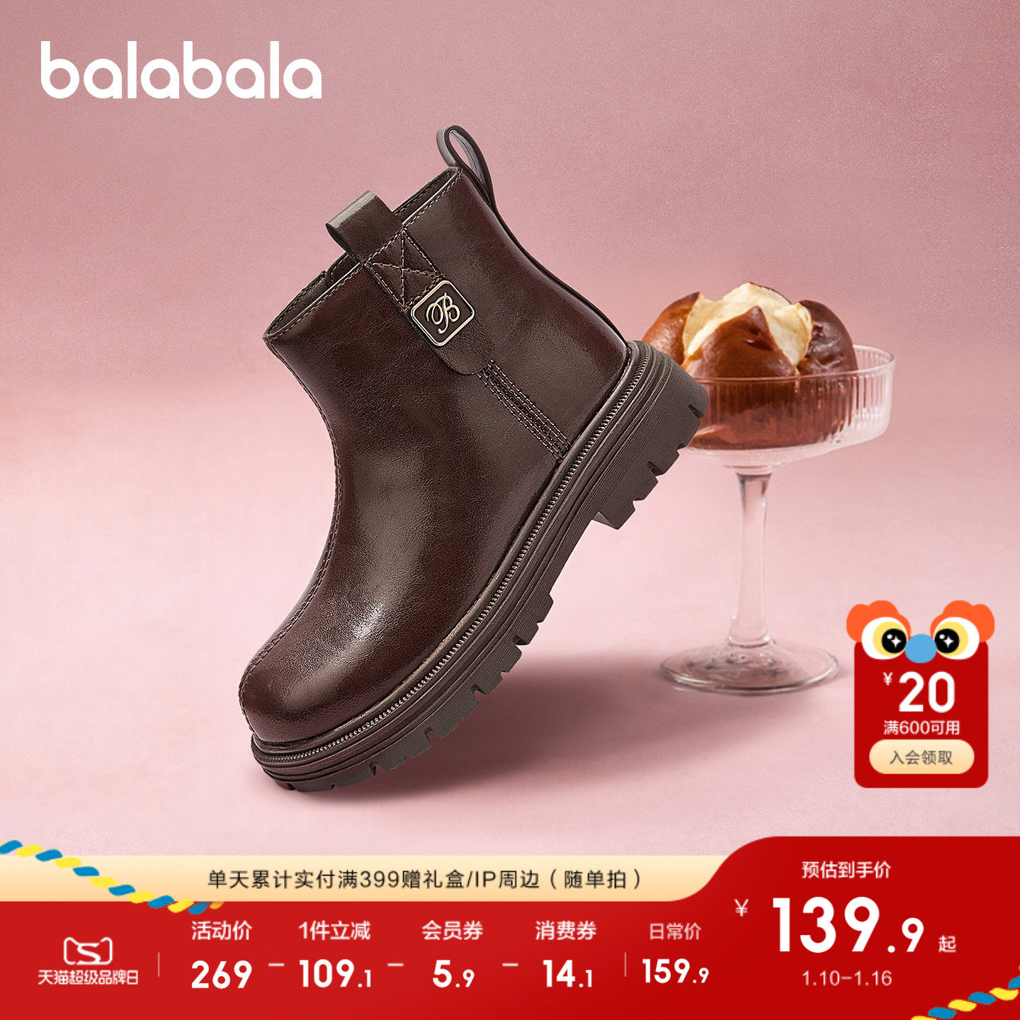【balaOne】巴拉巴拉童鞋儿童靴子女童马丁靴秋冬2026新拜年短靴
