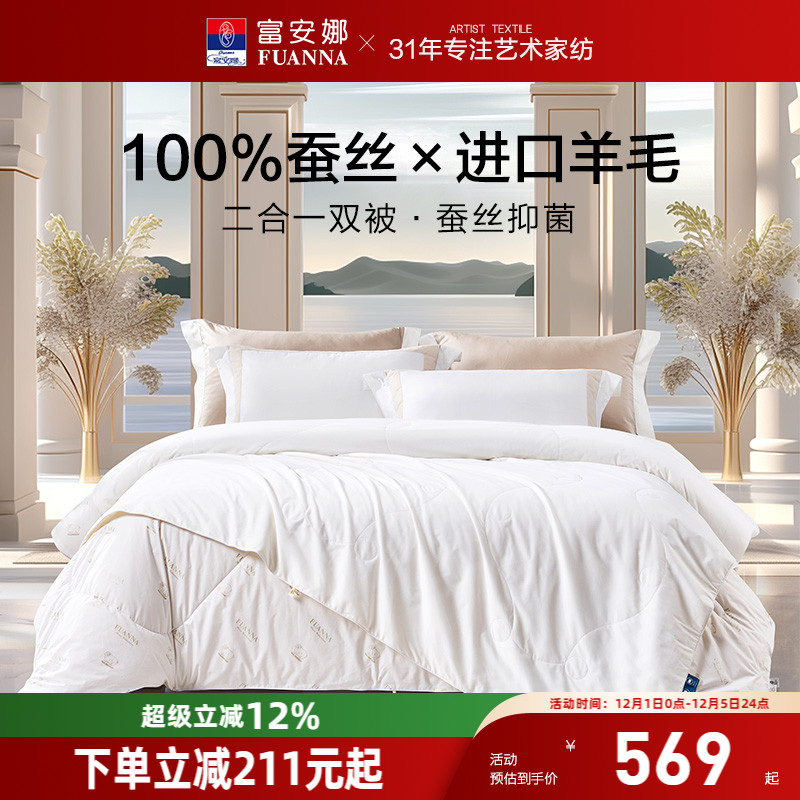 富安娜蚕丝被子母二合一被子澳洲羊毛被春秋双人保暖四季通用被芯