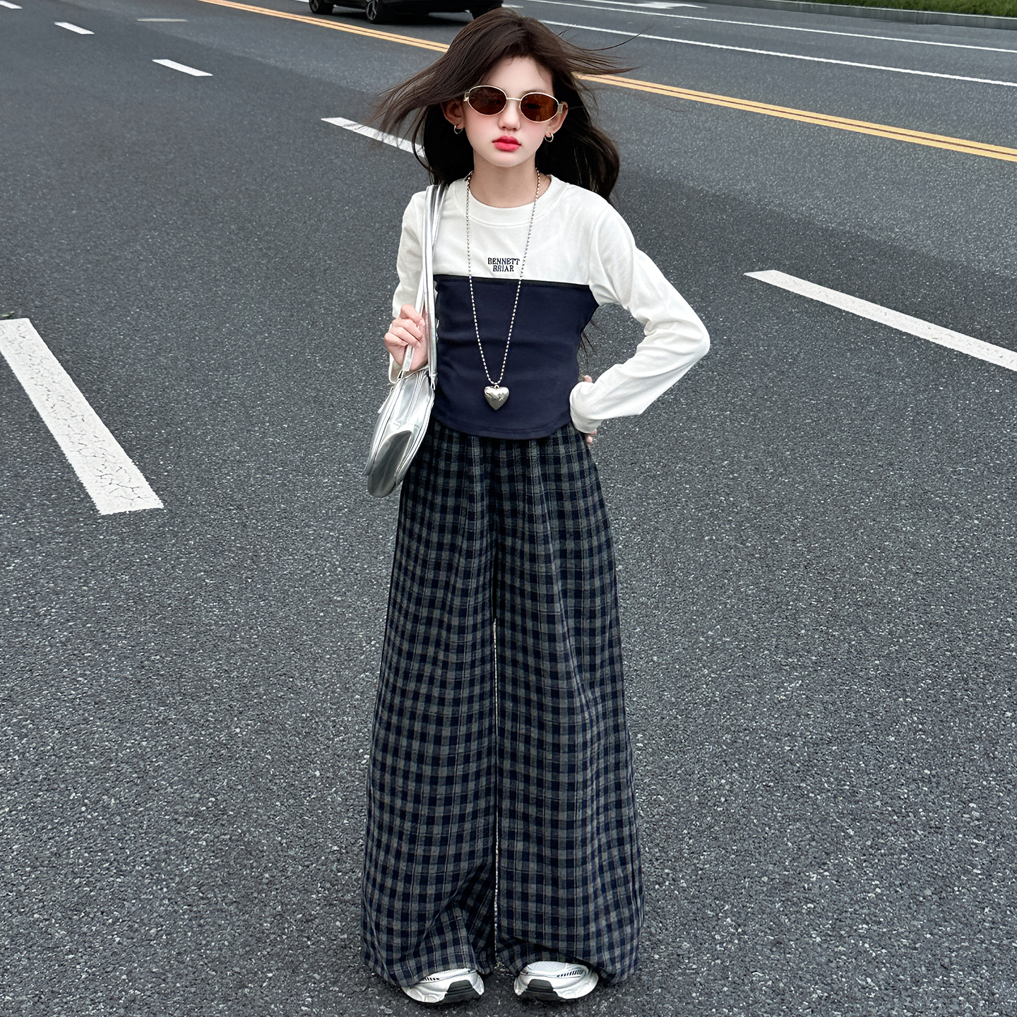 女童春秋套装2025新款洋气格子衬衫上衣女孩百搭阔腿复古牛仔裤