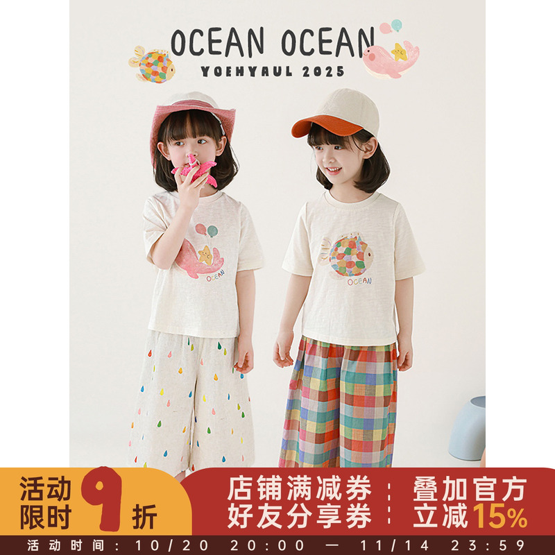 幼悠女童夏季套装儿童元气可爱罗纹圆领清凉短袖九分宽松阔腿裤潮