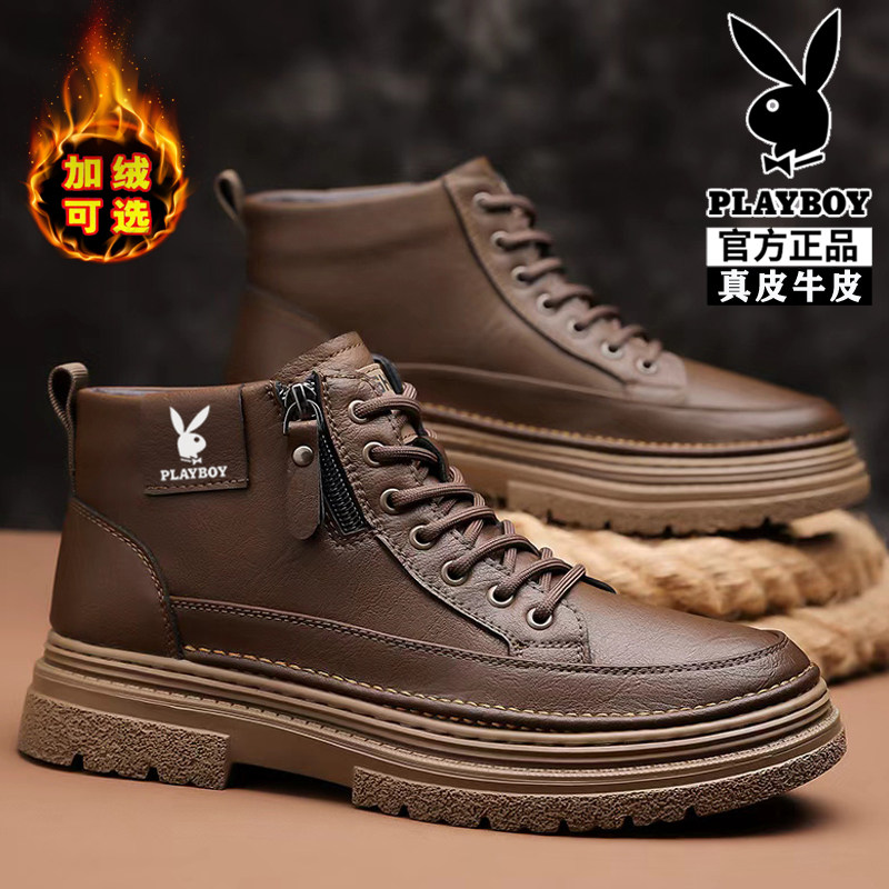 花花公子马丁靴男款真皮冬季加绒保暖休闲棉鞋百搭工装中帮男靴子
