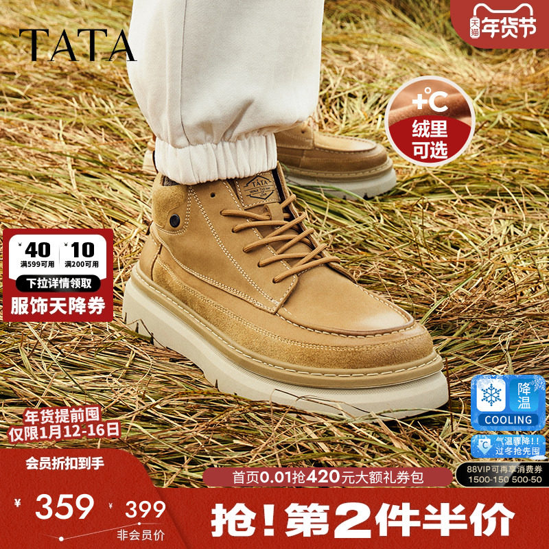 Tata他她厚底复古短靴男靴工装靴高帮男鞋真皮加绒户外马丁靴冬季