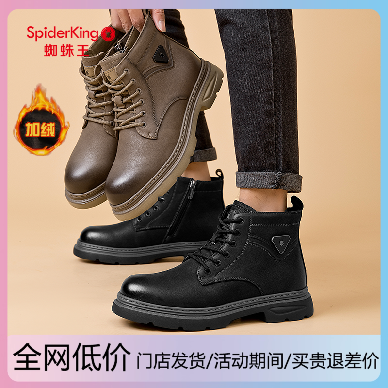蜘蛛王马丁靴男2024冬季新款真皮中高帮时装靴加绒保暖棉鞋男靴子