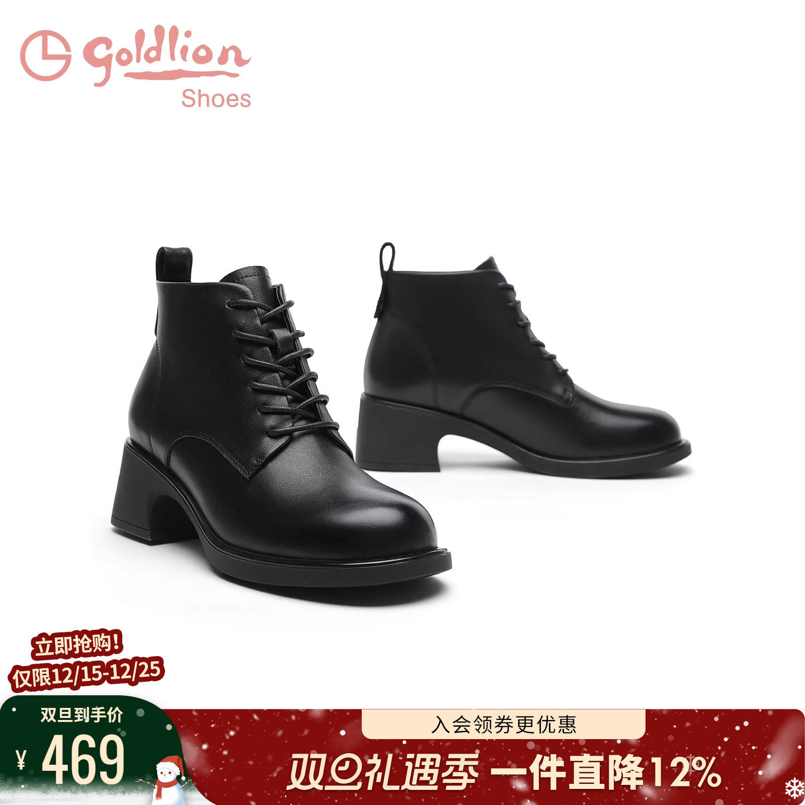 金利来休闲高跟鞋秋冬新款时尚女鞋真皮黑色中跟英伦马丁靴女短靴