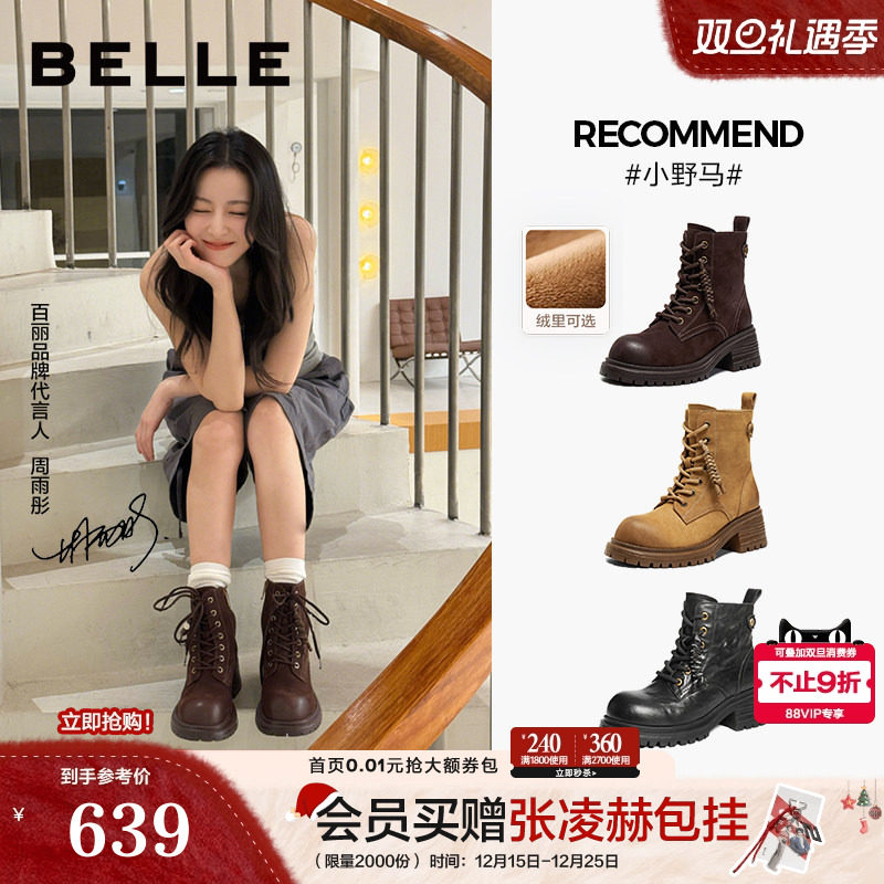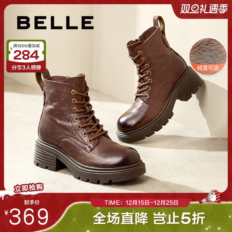 百丽厚底复古英伦风马丁靴女冬季新款工装靴加绒短靴子B9H1DDD4