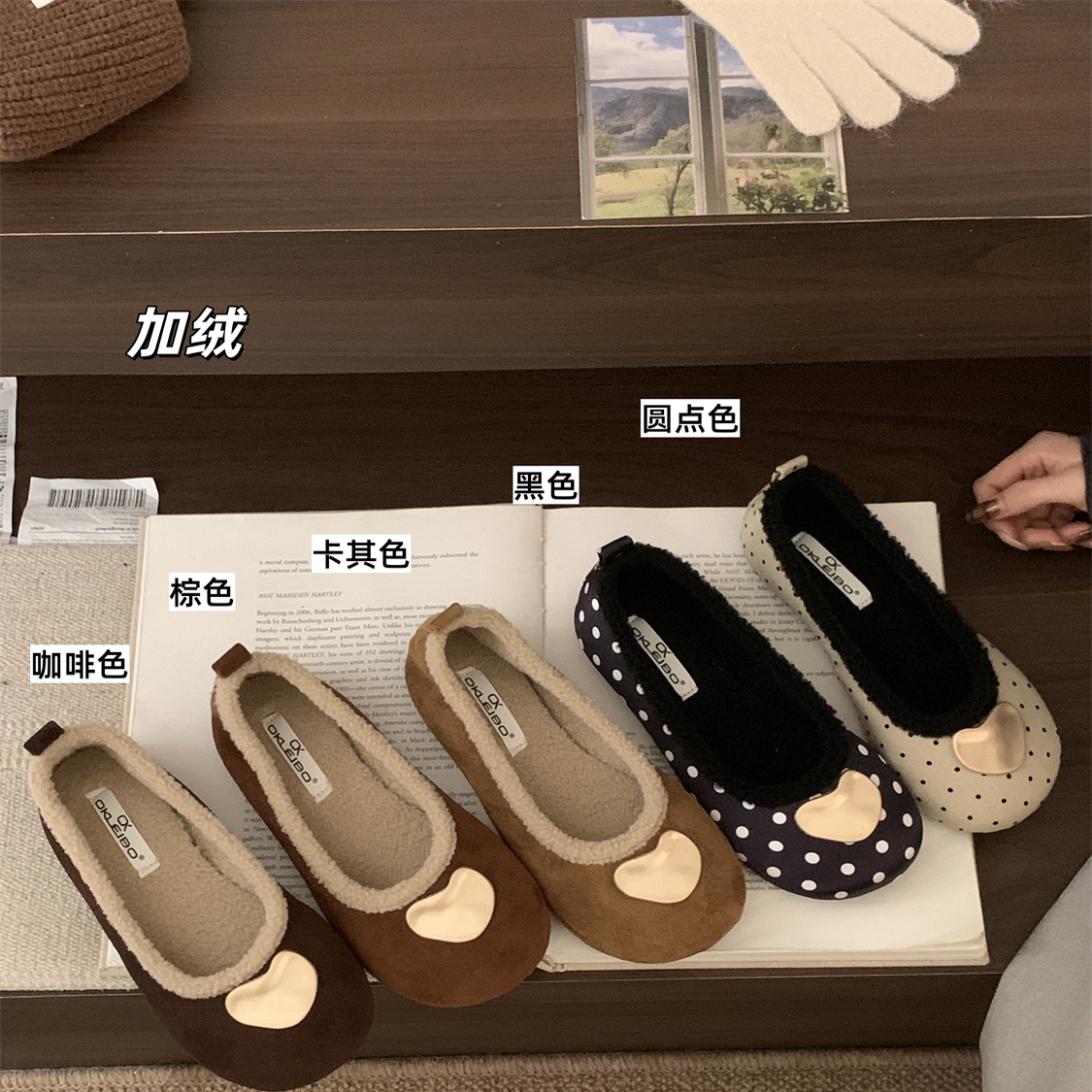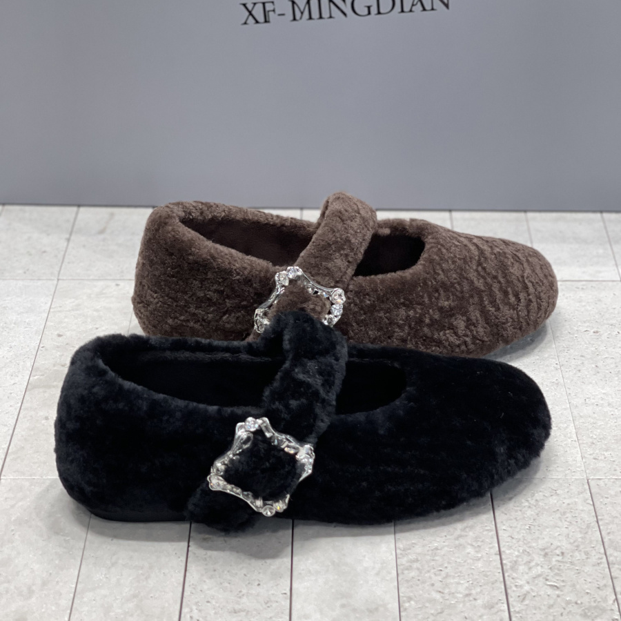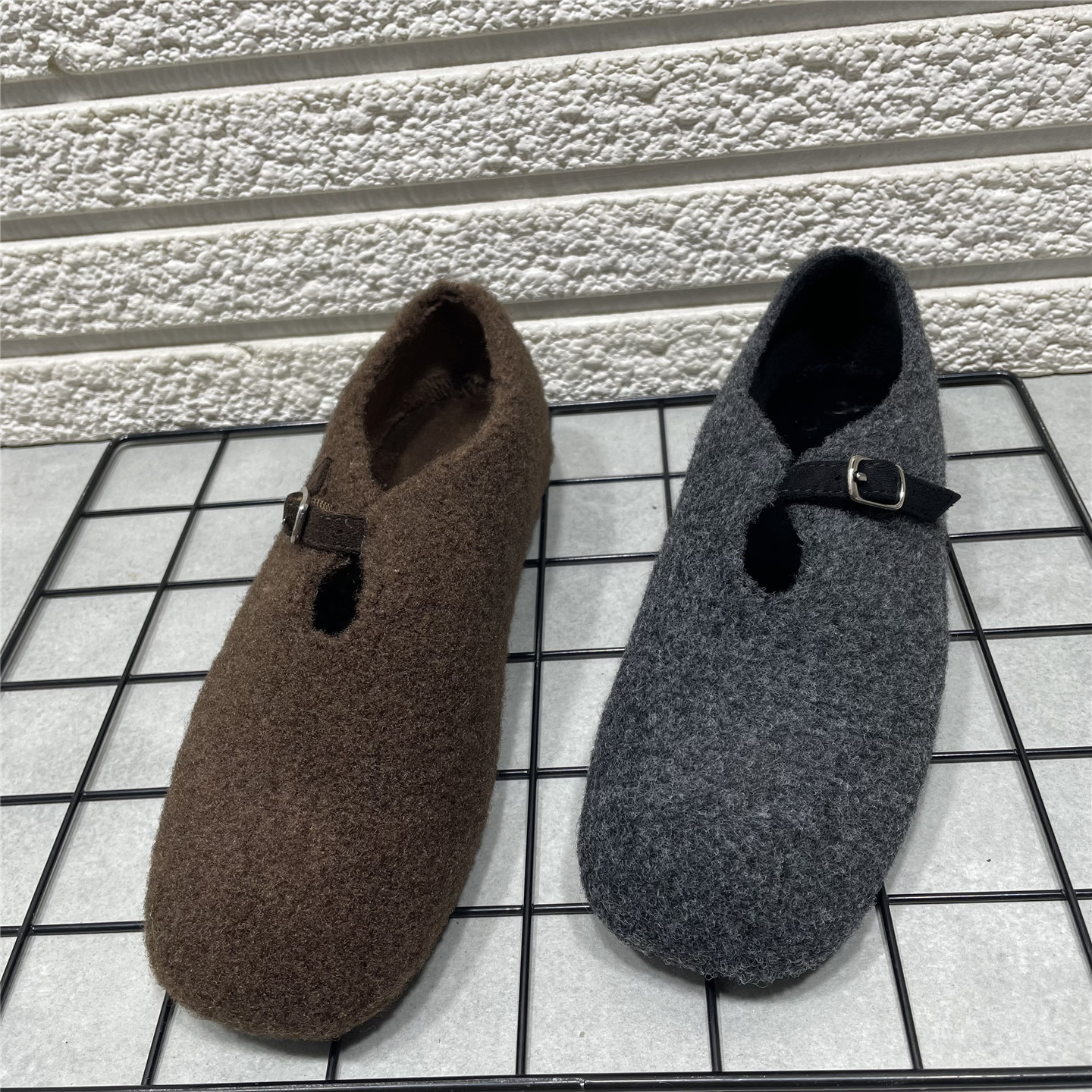 2025年加绒一字带扣玛丽珍鞋浅口平底单鞋女鞋软底豆豆鞋毛毛鞋女