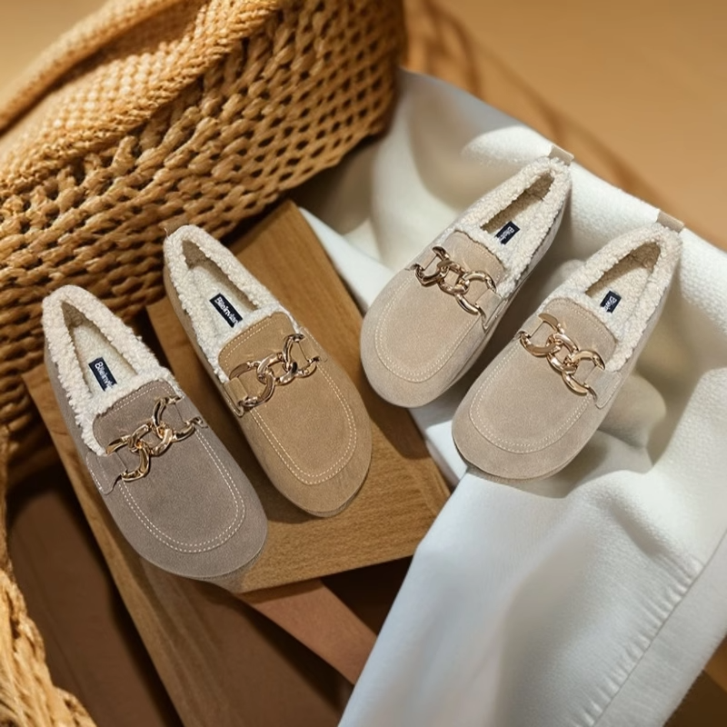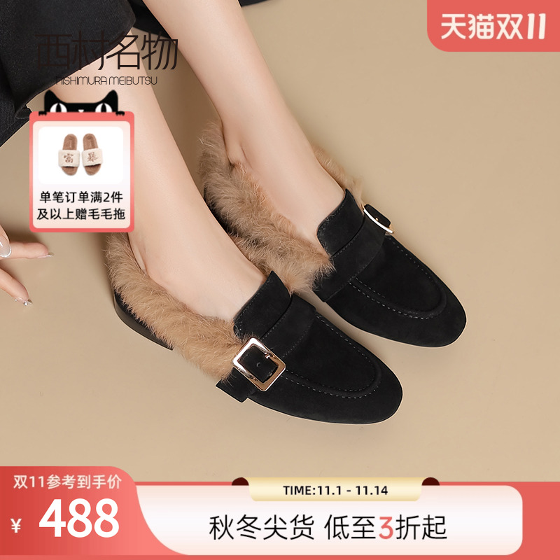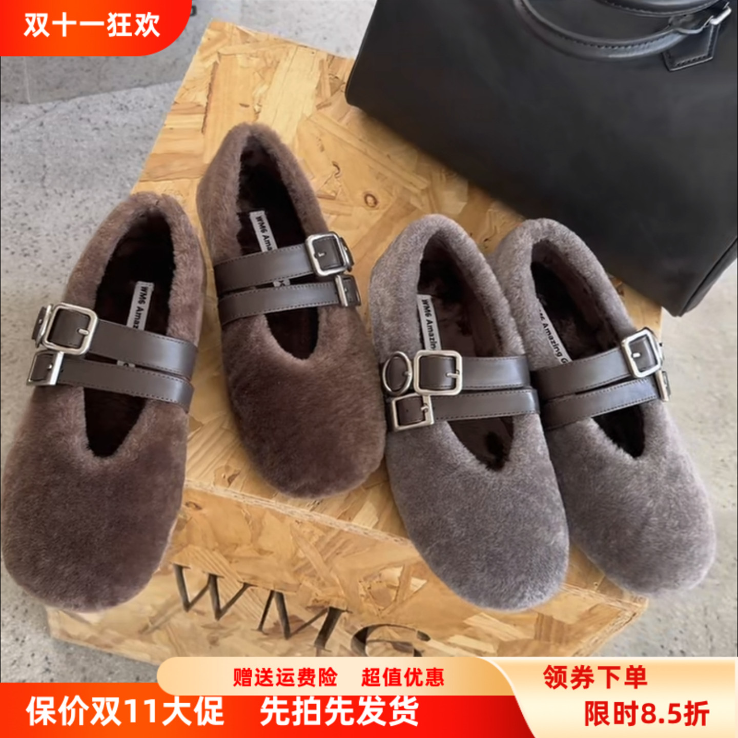 WM6女鞋2025秋冬新款欧货真皮圆头皮带扣加绒保暖豆豆鞋毛毛鞋潮