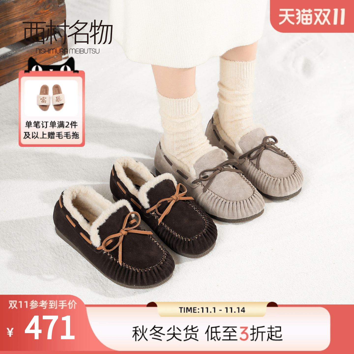 西村名物2025秋冬新款一脚蹬加绒平底蝴蝶结雪地豆豆鞋毛毛鞋真皮