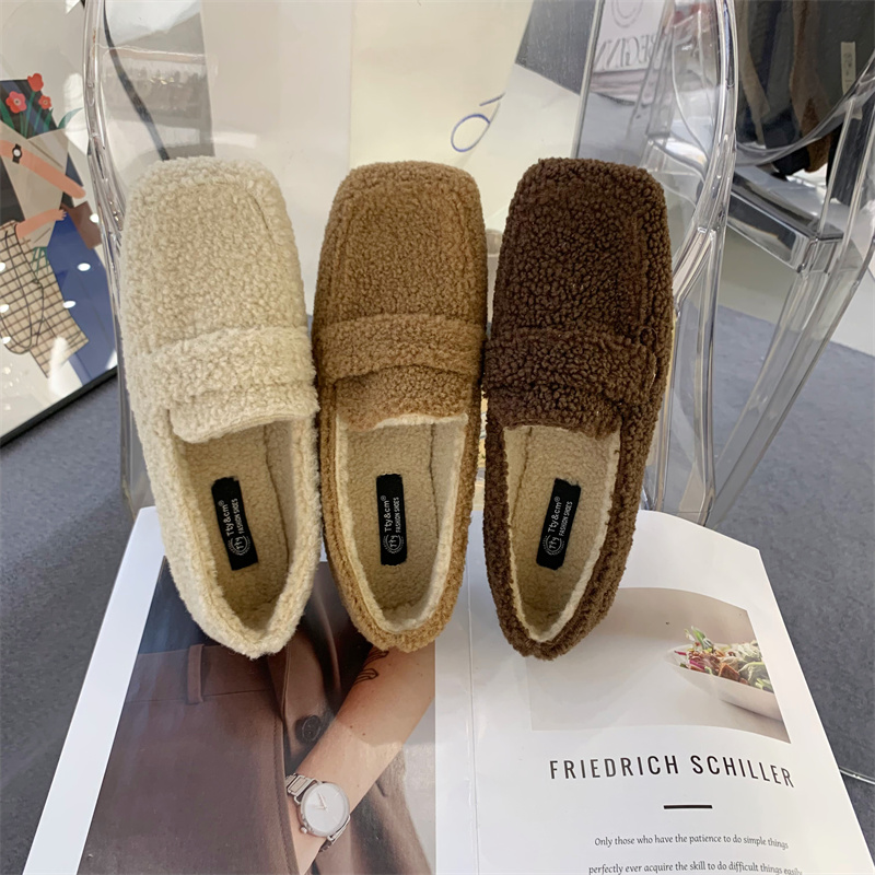 断码处理平底方头毛呢单鞋女秋冬新款加绒棉鞋一脚蹬豆豆鞋毛毛鞋