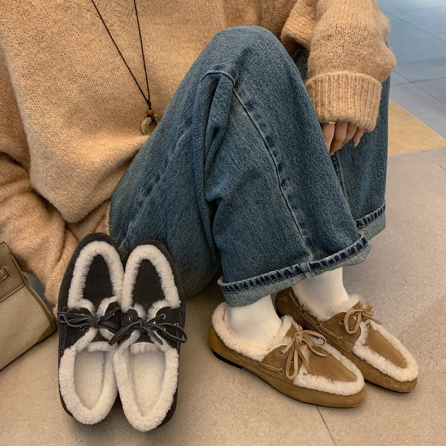 SC防泼水!复古森系森女系蝴蝶结加绒保暖日系豆豆鞋毛毛鞋棉鞋