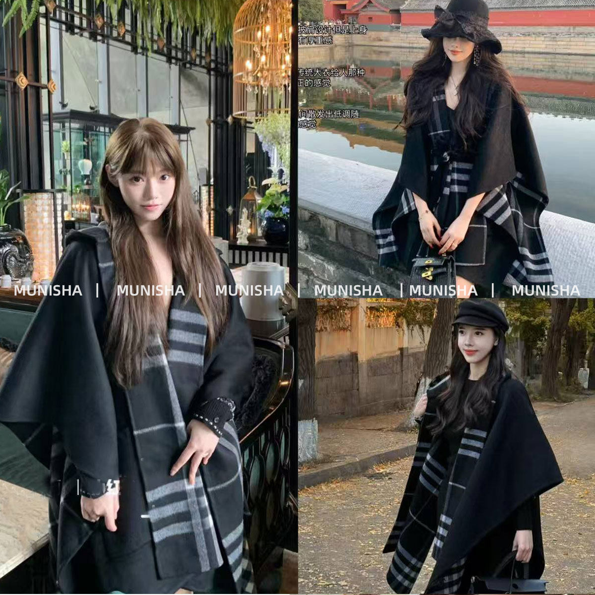 MUNISHA 顶配版 张婧仪同款经典格子 100%羊绒 披肩斗篷围巾女