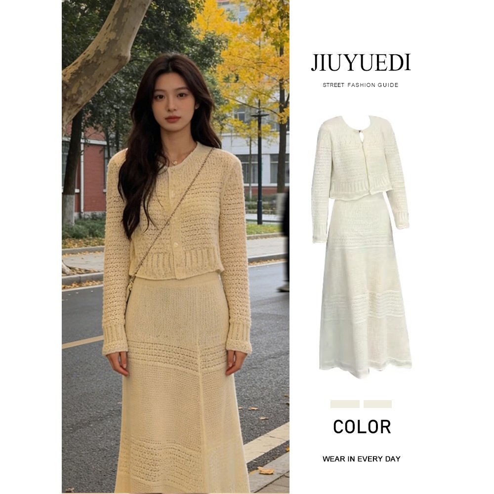 JIUYUEDI九月底法式温柔风镂空钩花针织开衫半身裙女秋季气质套装