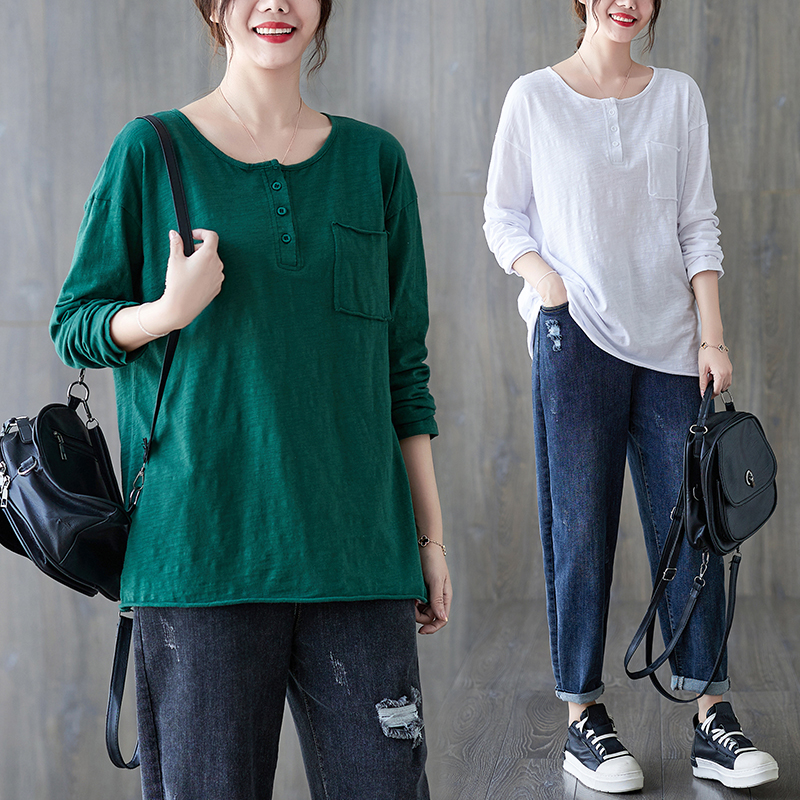 春秋季新款女装宽松大码圆领长袖T恤衫纯色基本款竹节棉打底衫女