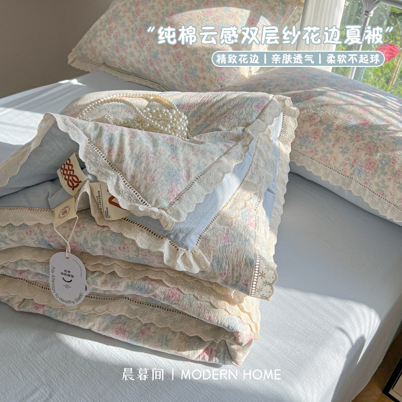 少女心夏季空调被纯棉皱皱纱夏被四件套法式玫瑰刺绣蚕丝被粉蓝色