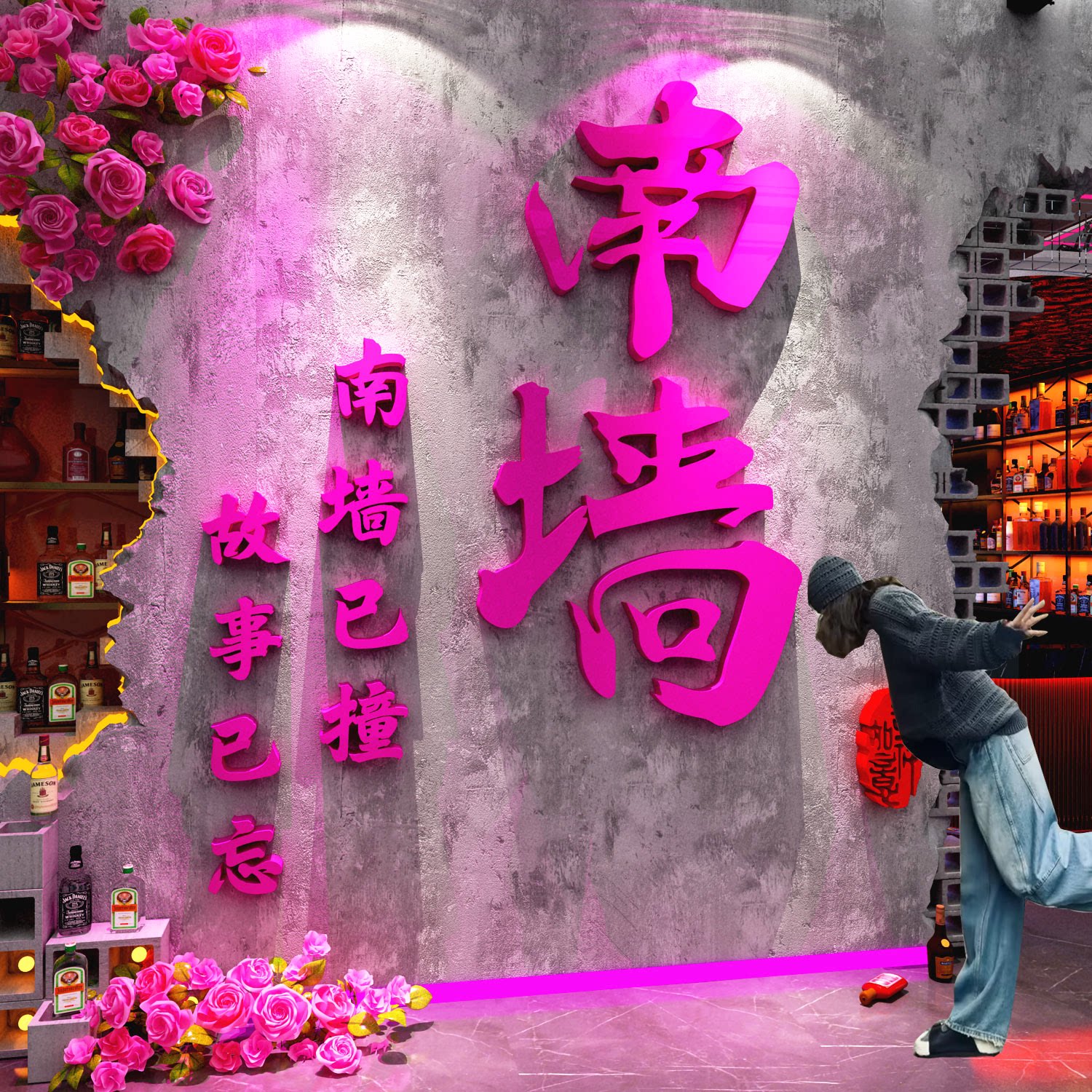 2026网红打卡撞南墙面贴清吧小酒馆装饰场景氛围布置工业风烧烤店