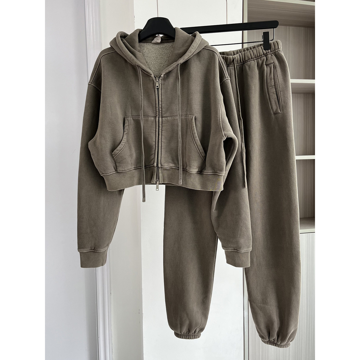 潮牌小众2025秋冬款时尚复古风加绒抽绳拉链连帽衫休闲运动套装女