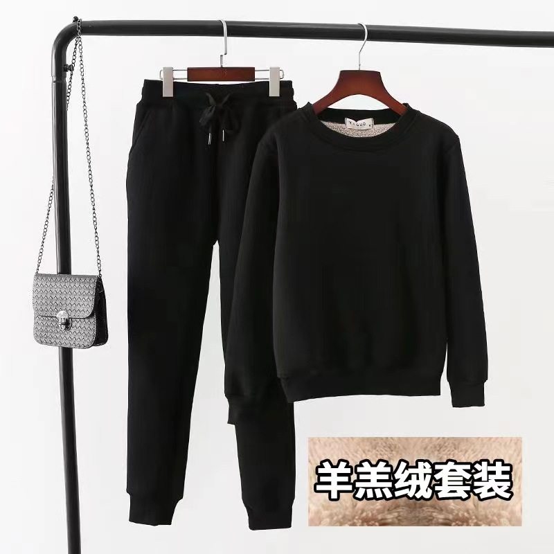 羊羔绒圆领运动套装女秋冬款韩版宽松套头保暖卫衣大码加厚两件套