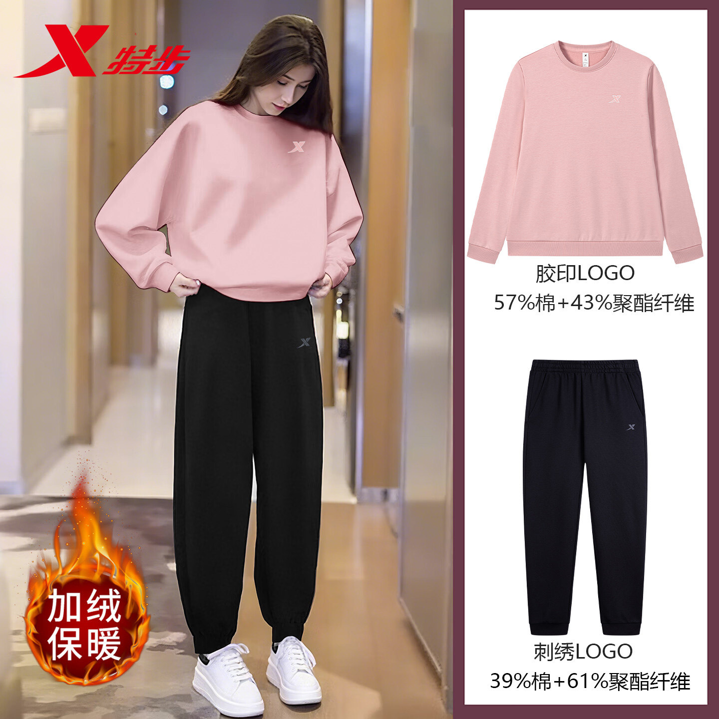 特步运动套装女秋冬款加绒圆领套头卫衣收口卫裤长裤跑步休闲女装