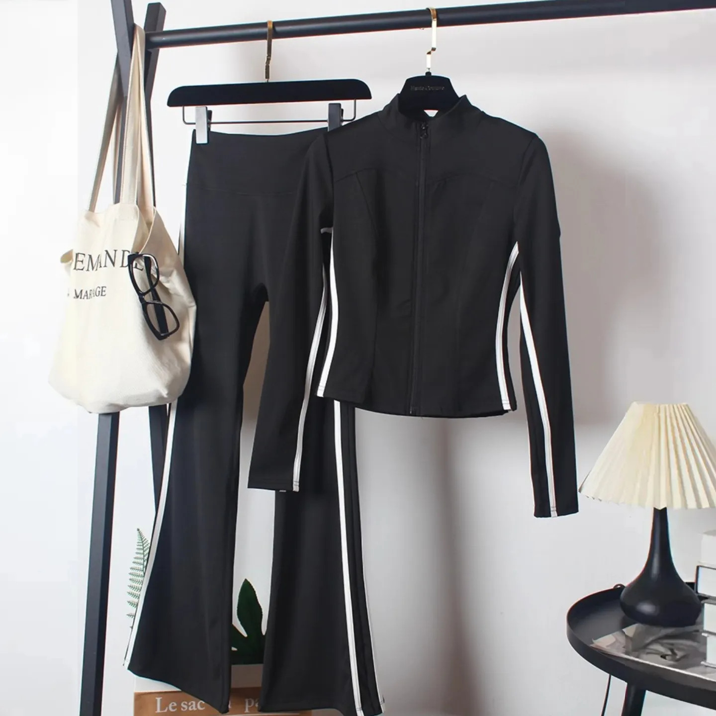 健身运动套装女秋冬款高腰喇叭裤显瘦舞蹈跑步拉链条杠外套三件套