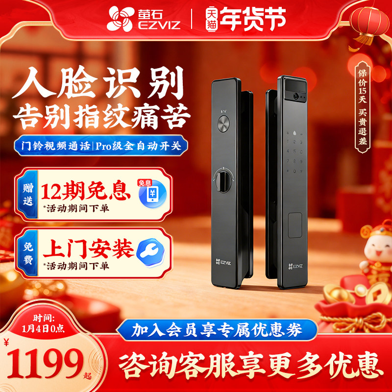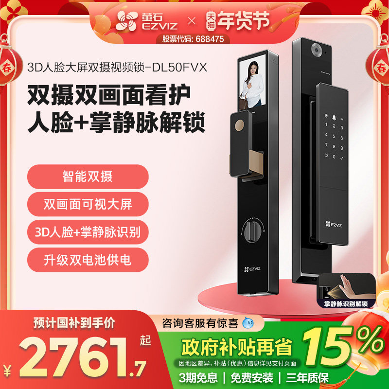 萤石AI3D人脸掌静脉锁Y3000FVS PLUS猫眼大屏视频锁电子密码门锁