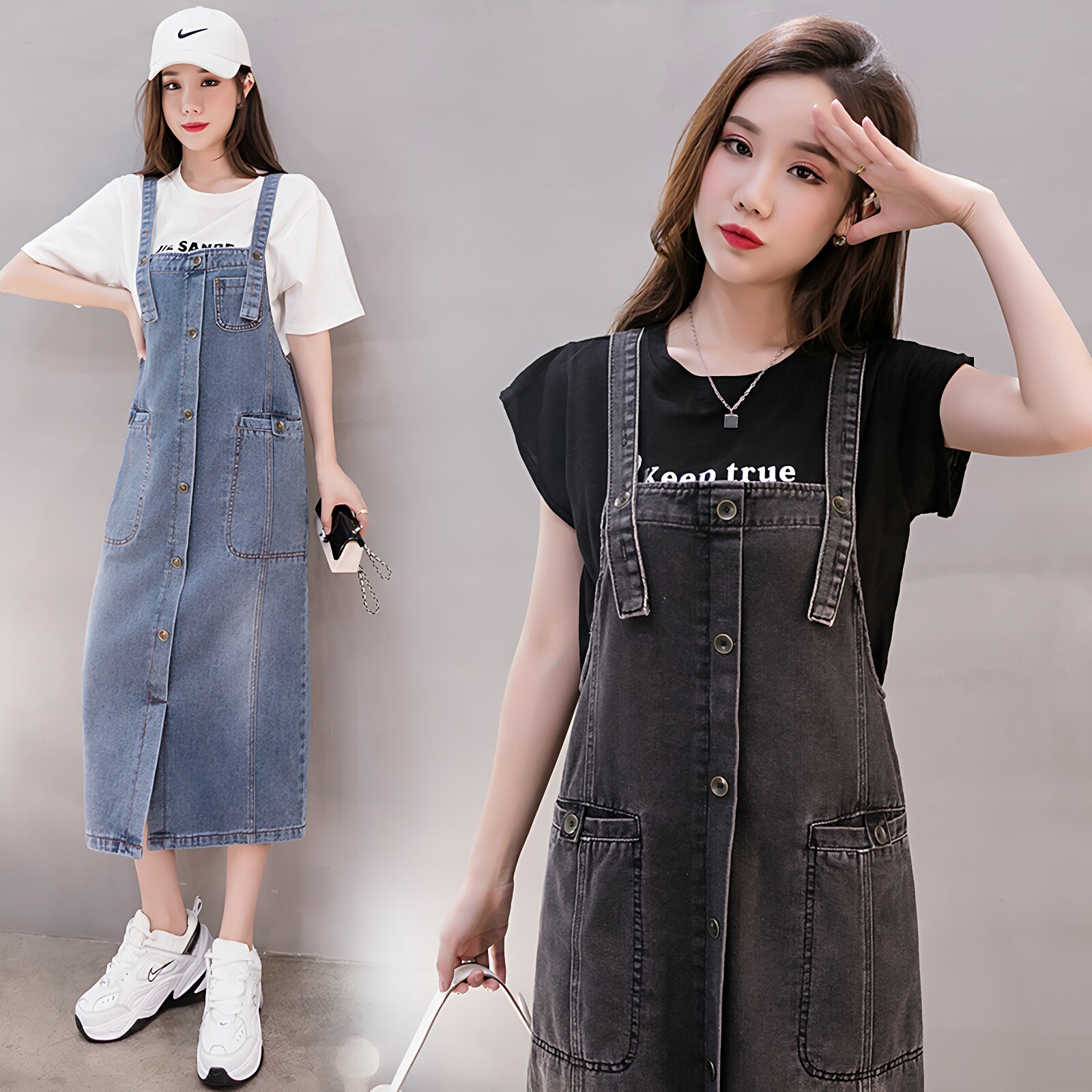 2025中长裙新款前开叉百搭宽松收腰背带裙牛仔吊带a字连衣裙潮裙