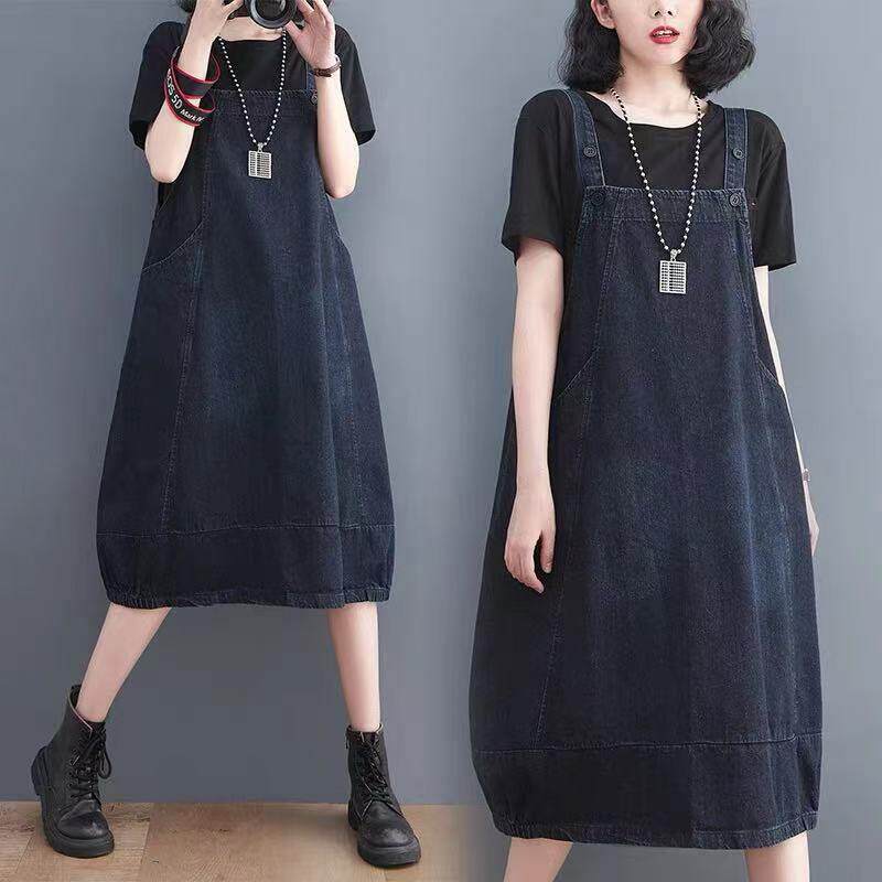 2026中长裙新款加大码百搭宽松收腰背带长裙牛仔吊带a字连衣裙潮
