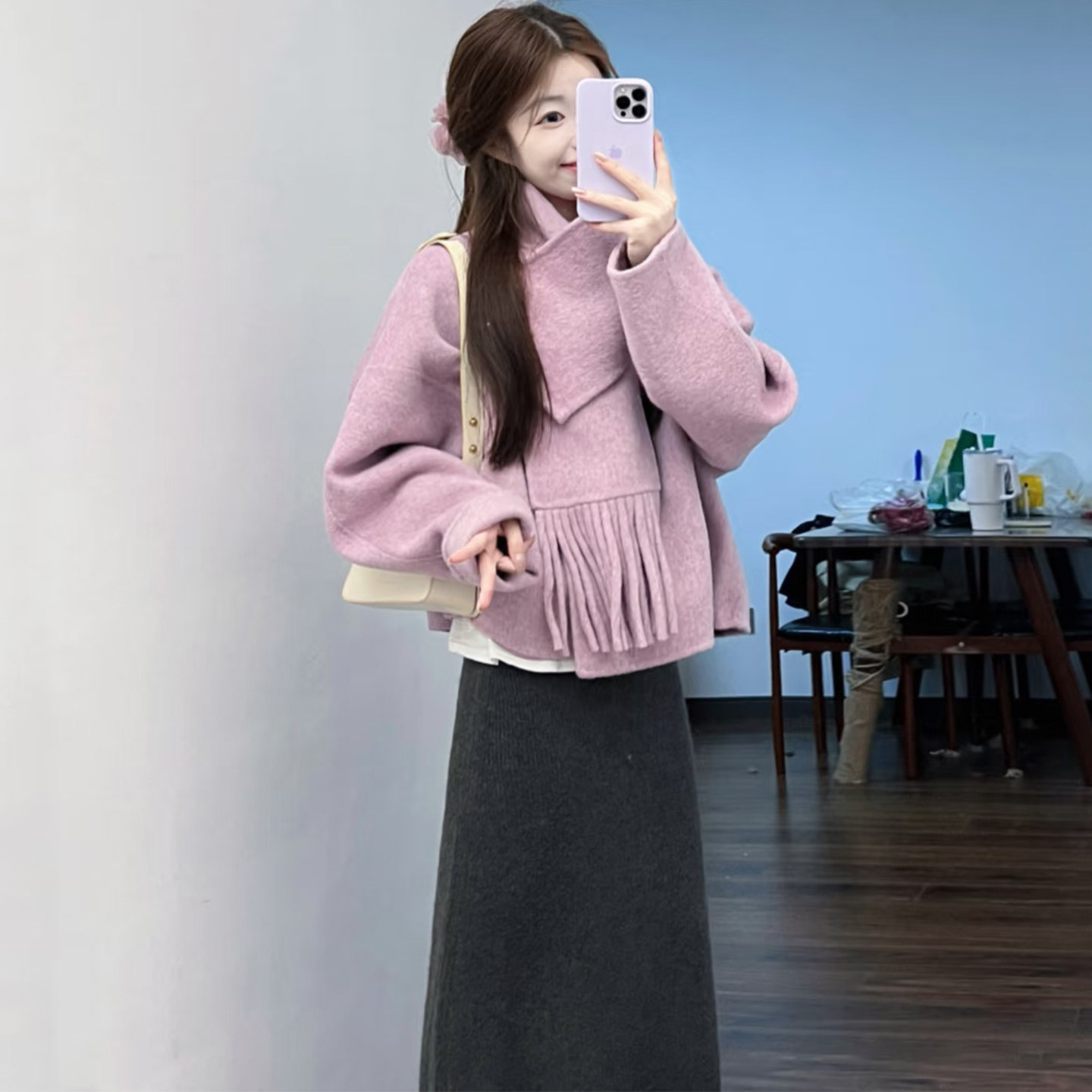 温柔风粉紫色流苏围巾毛呢外套女秋冬韩版小个子宽松显瘦呢子大衣