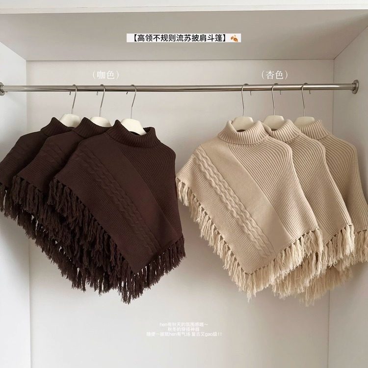 2025秋冬女装蝙蝠衫外穿短外套披肩上衣宽松套头半高领流苏斗篷女