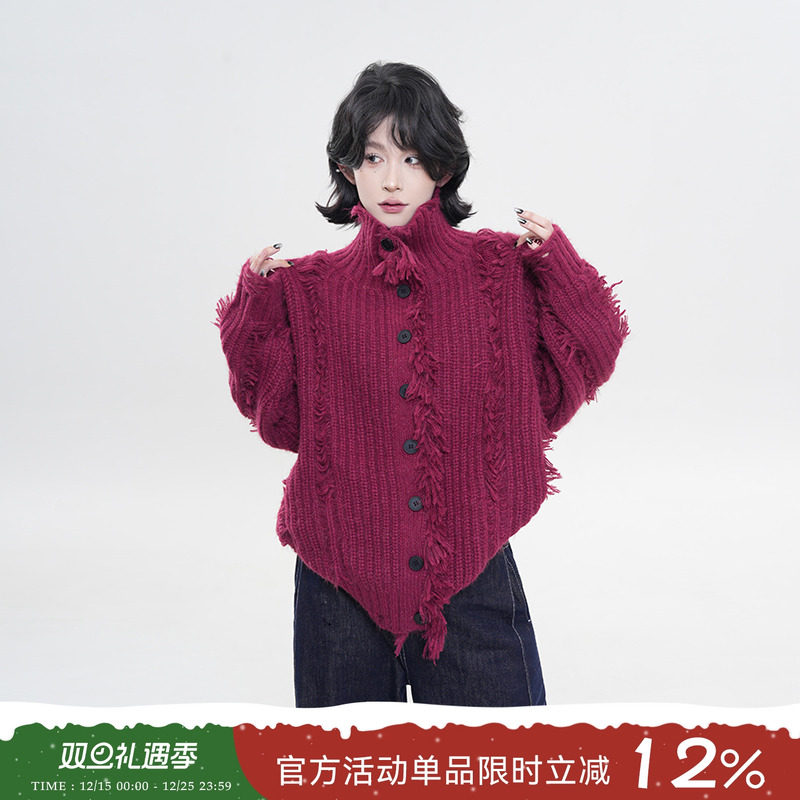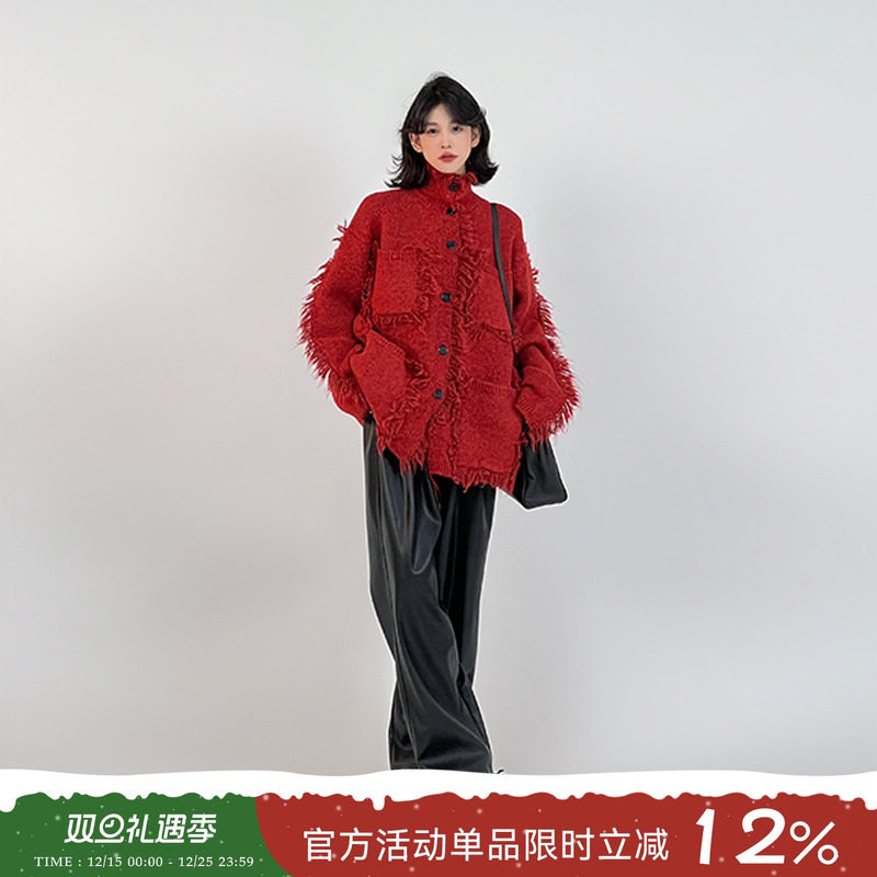 吴童自制红色流苏设计感毛衣针织外套女秋冬韩系小众休闲气质上衣