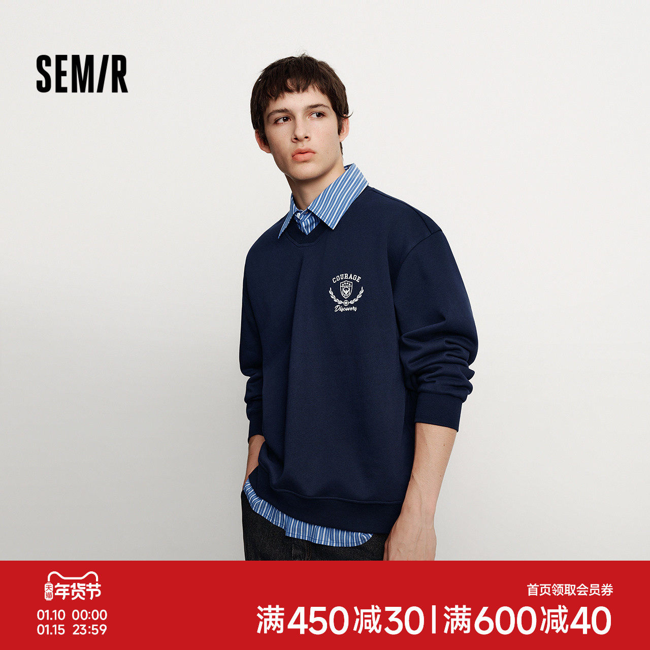 森马卫衣男冬季学院风假两件情侣装加绒2025新款oversize绣花上衣