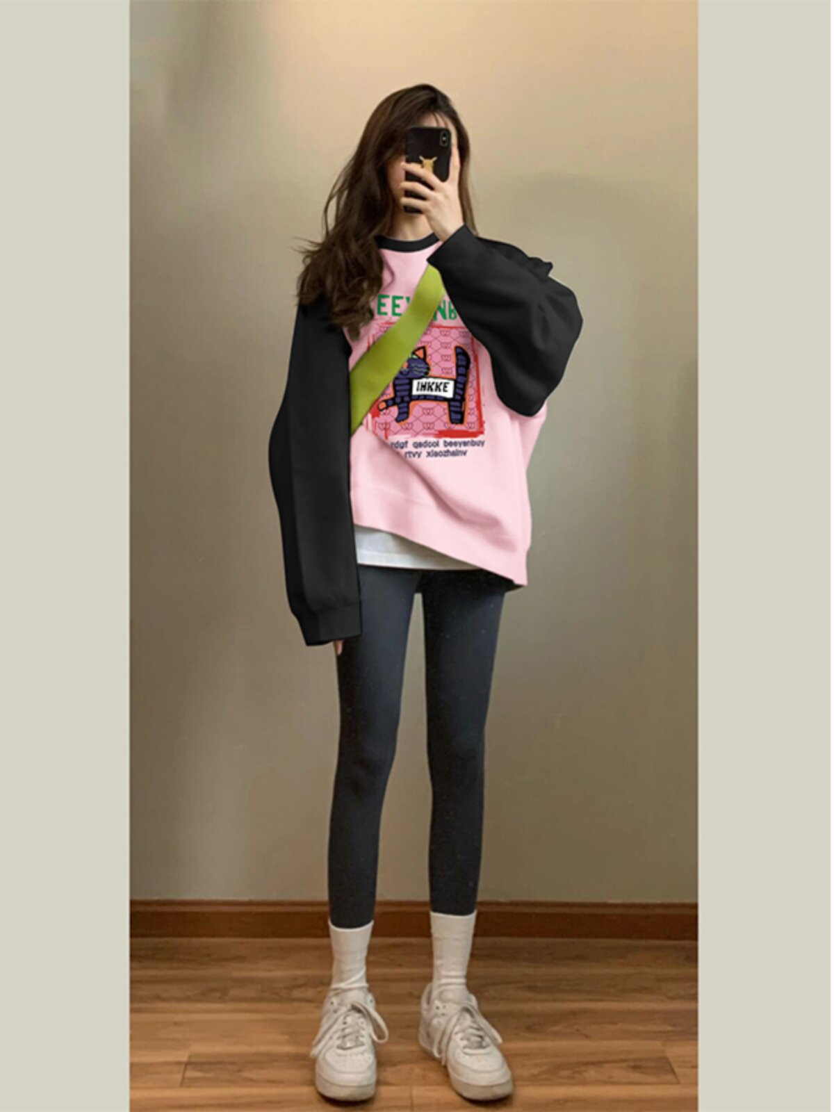 撞色刺绣字母连帽卫衣女秋冬oversize加绒加厚外套宽松慵懒风上衣