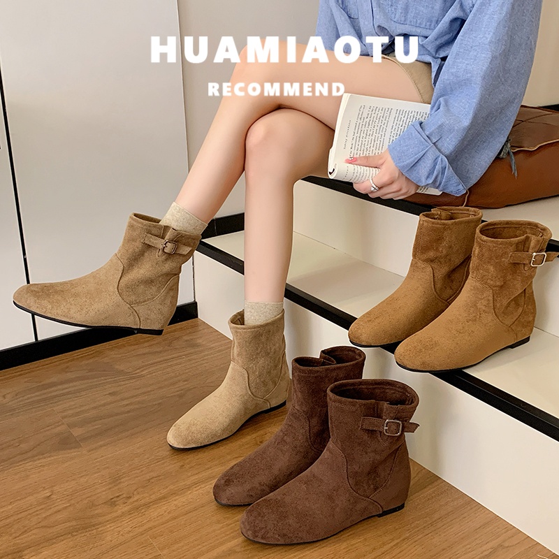 平底内增高短靴女新款靴子2025年秋冬季圆头女靴短筒靴小众瘦瘦靴
